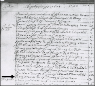 A baptismal record for “Mary Neemes, da of Henry and Ellen uxor” dated 31 July 1651, St Clement-Danes, Westminster