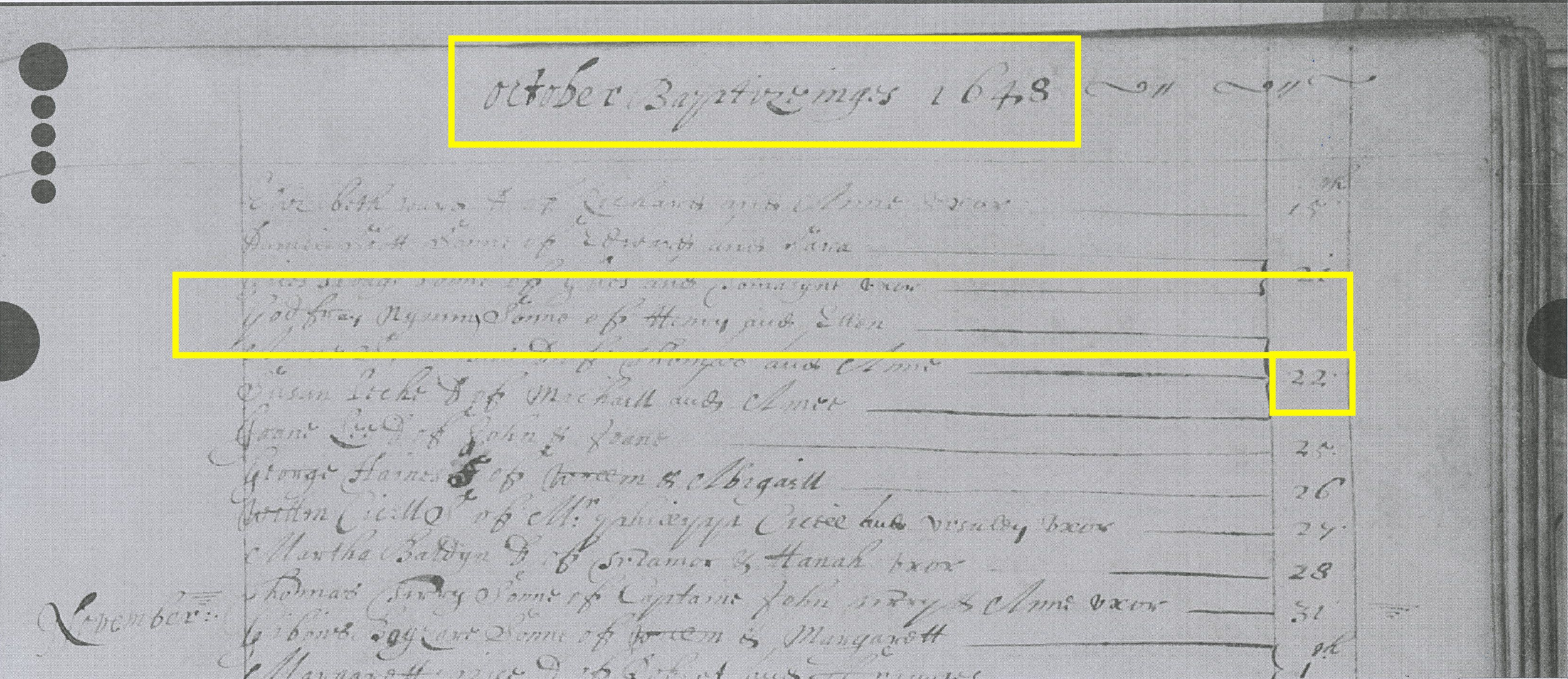A baptismal record for “Godfrey Nymm son of Henry and Ellen” dated 22 October 1648, St Clement-Danes, Westminster, London;